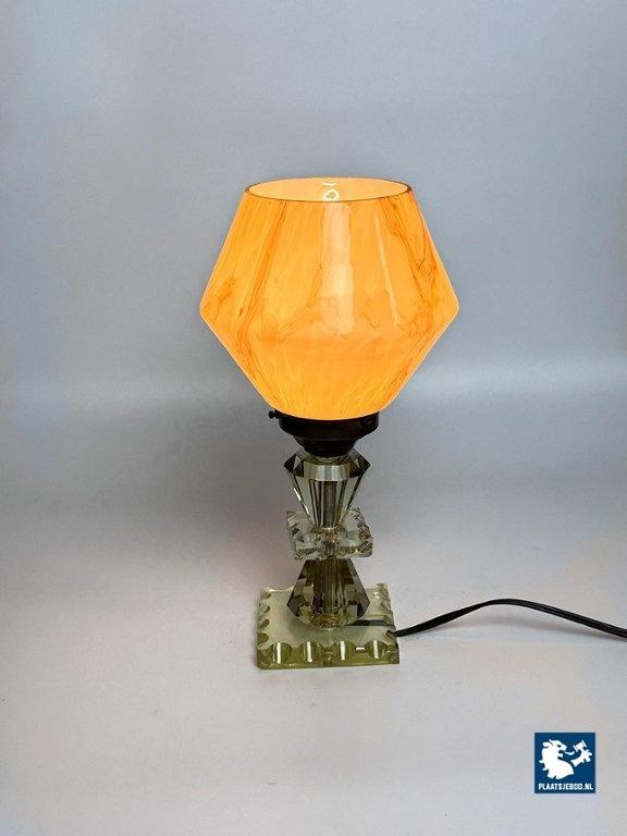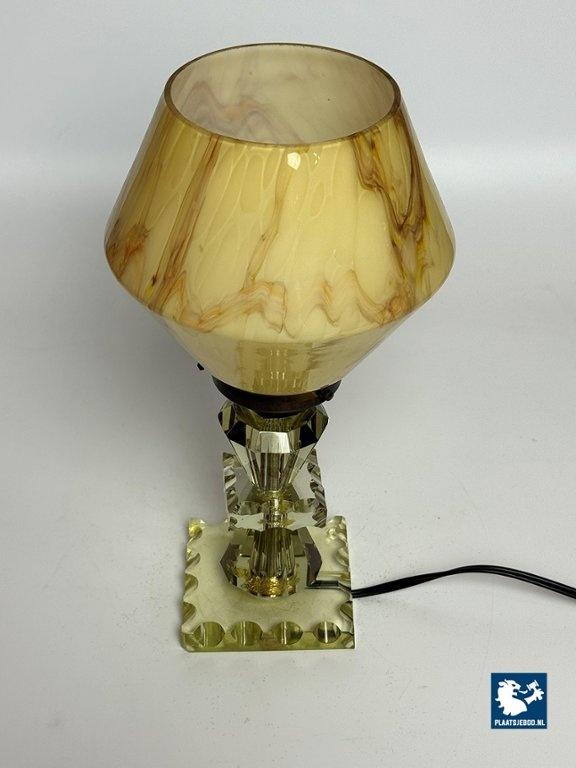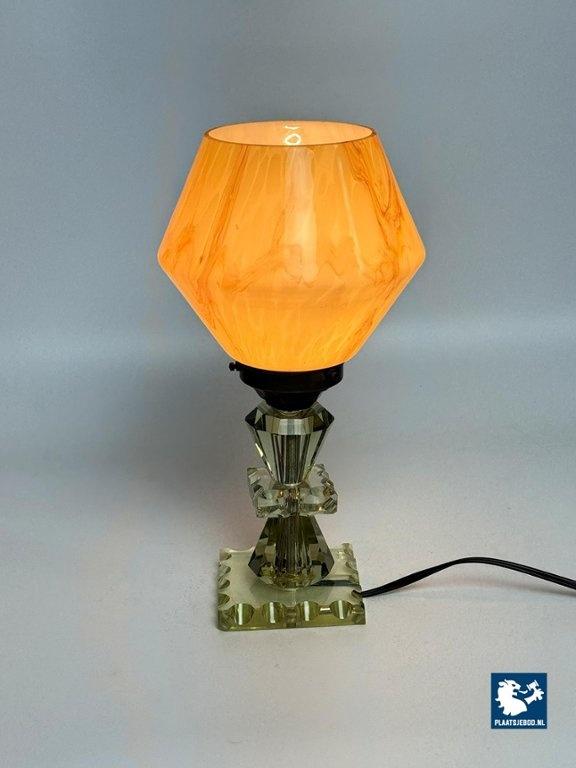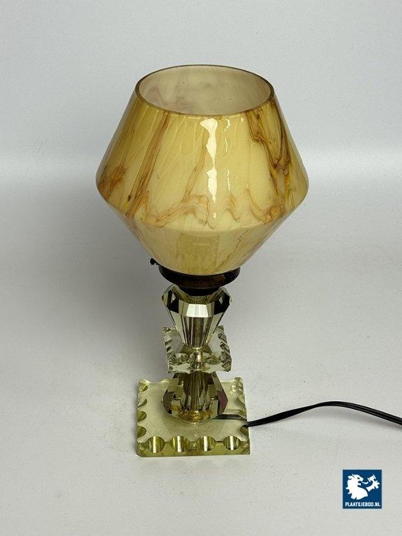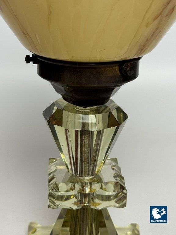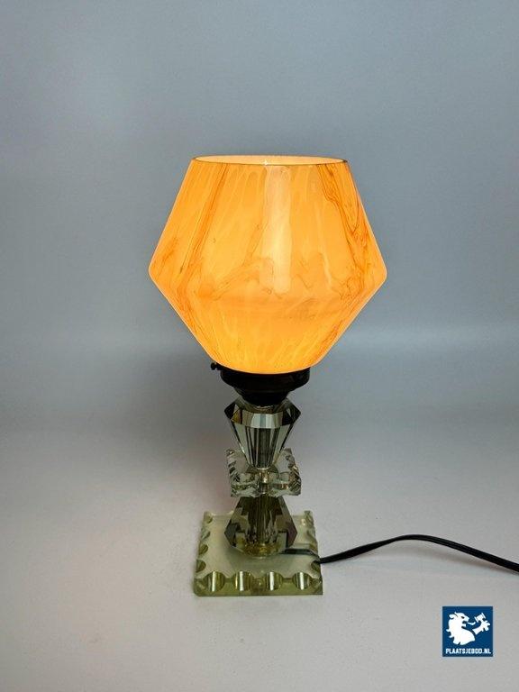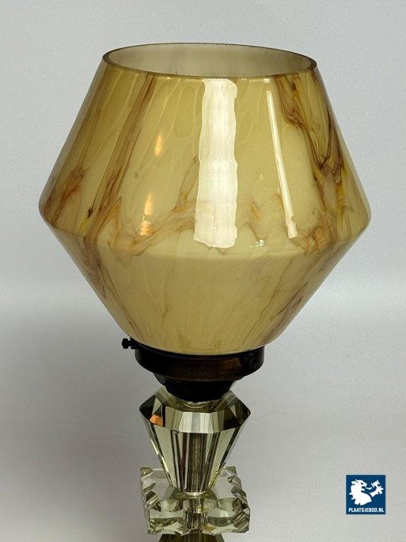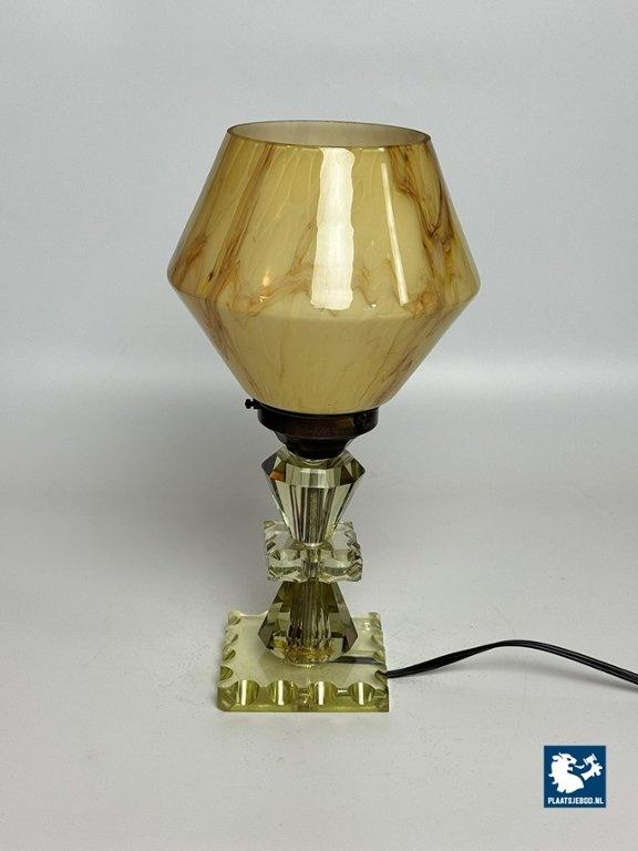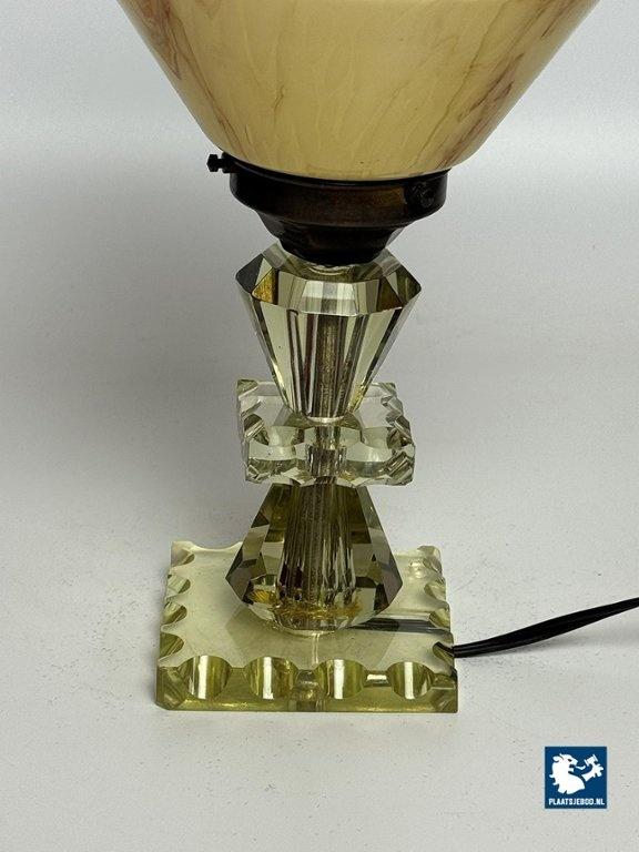 Elegant Art Deco style table lamp featuring a softly marbled glass shade and a faceted, light green cut-crystal glass base. The lamp produces a warm and atmospheric glow and reflects the decorative yet refined character of Art Deco-inspired lighting. Fully tested and in very well preserved vintage condition, with minor wear consistent with age and use. A charming and timeless accent piece. Dimensions: Height 30 Diameter 15 cm
