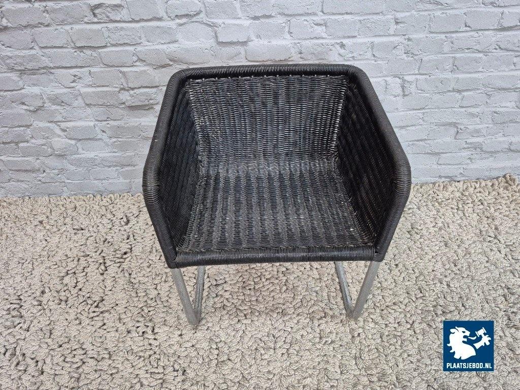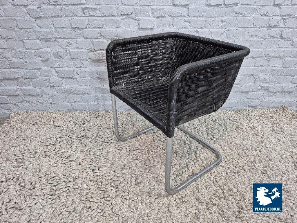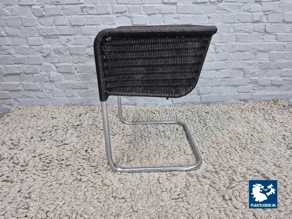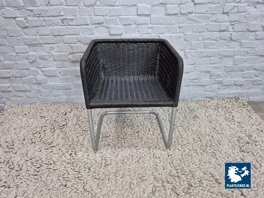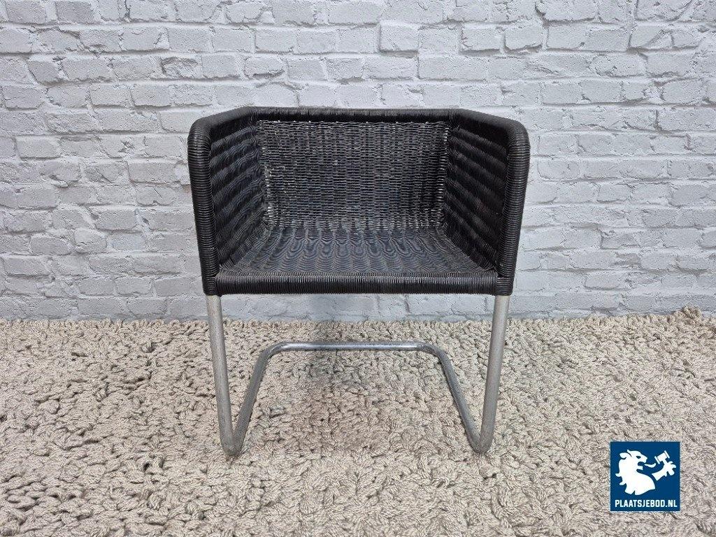 Its clean lines, floating cantilever construction and graphic, almost architectural presence clearly reflect Bauhaus principles of form following function. The black plastic mesh offers both visual lightness and practical durability, making the chair suitable for both domestic and office interiors.