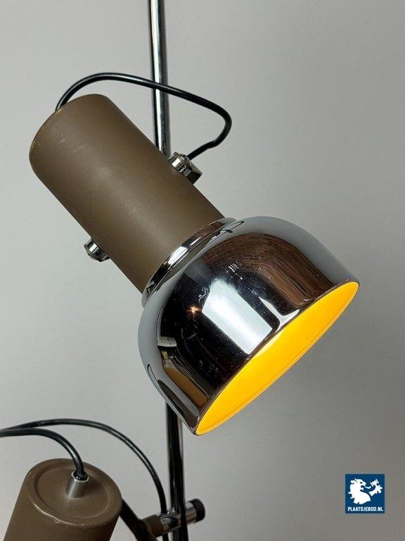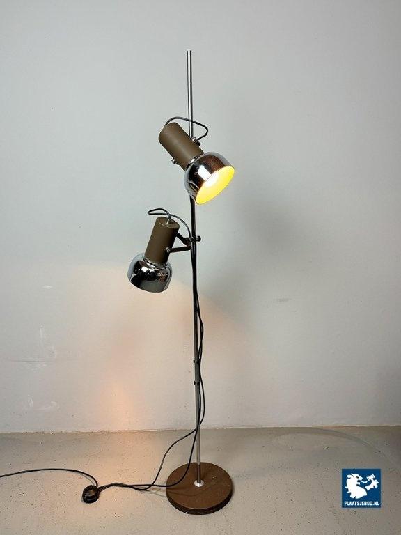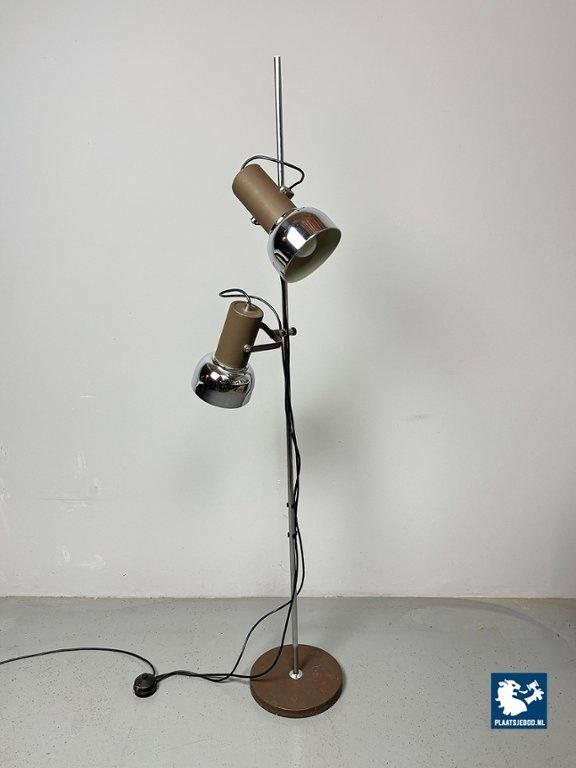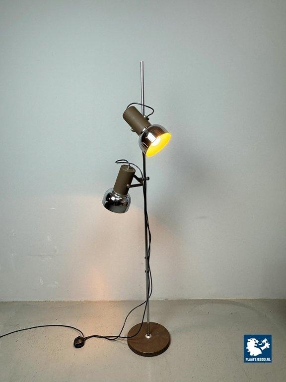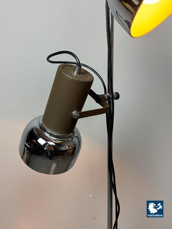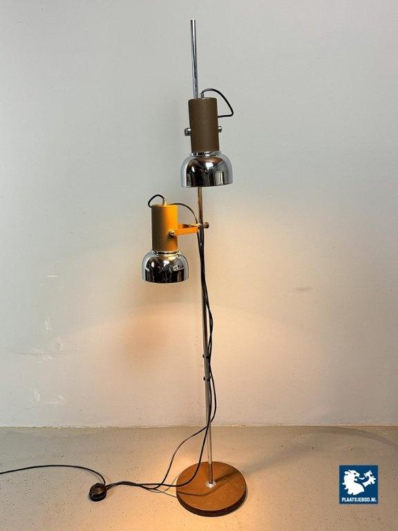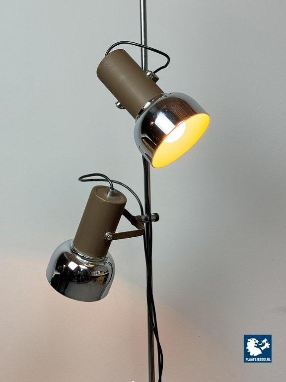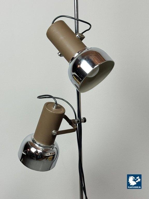 Vintage chrome floor lamp from the 1970s, equipped with two adjustable spotlights allowing both directional and ambient lighting. The clean-lined metal construction reflects the functional modernism of late mid-century design. The lamp provides atmospheric light, is fully functional, and remains in original vintage condition with light wear consistent with age and use. Total height pedestal: 164 Total width 40 Shade: Height 24 Diameter 15 cm