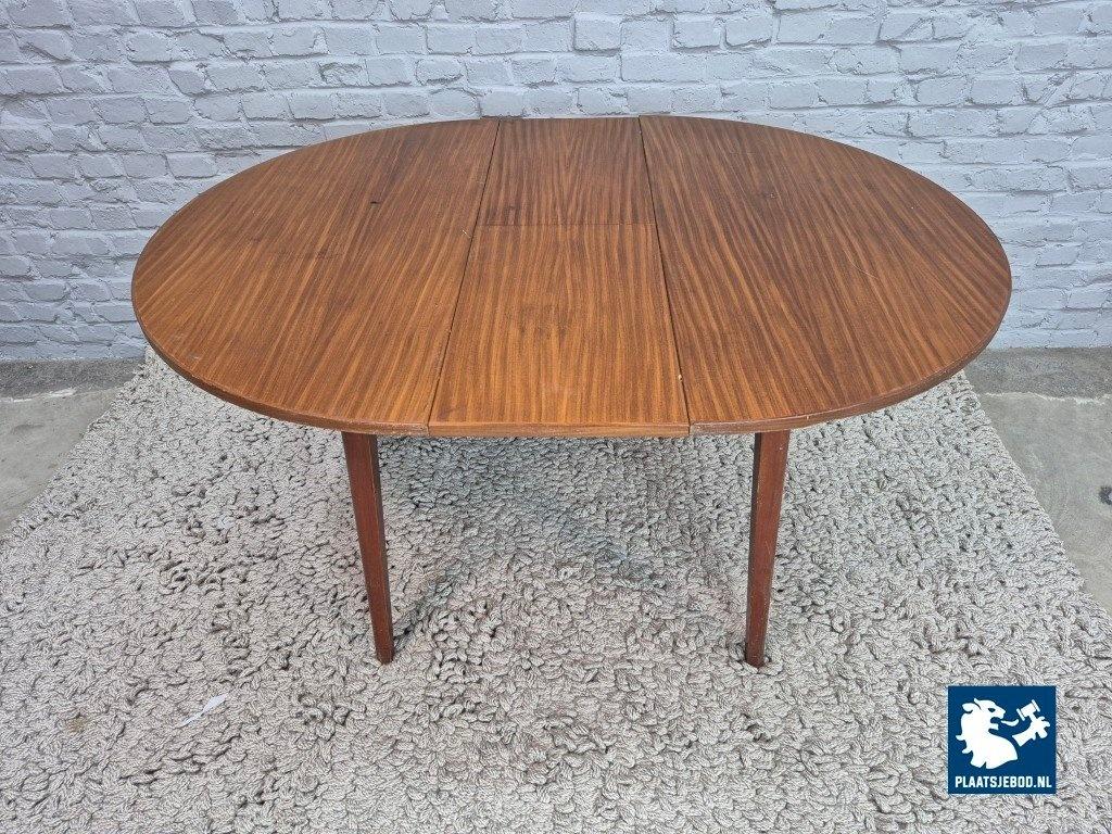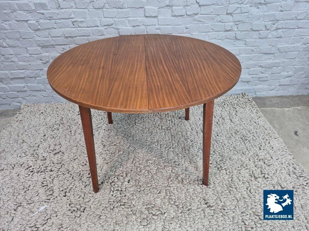 Round vintage dining table with a warm wood veneer finish, designed with a central extension leaf that transforms the table into an elegant oval shape. A practical and versatile piece, suitable for everyday kitchen use as well as larger gatherings. The table stands on slender tapered wooden legs and has a balanced, understated mid-century appearance that fits easily into a variety of interiors. As with all vintage items, light signs of use may be present and contribute to its authentic character. Dimensions: Height 73 Width 136/105 Depth 105 Seating height cm.