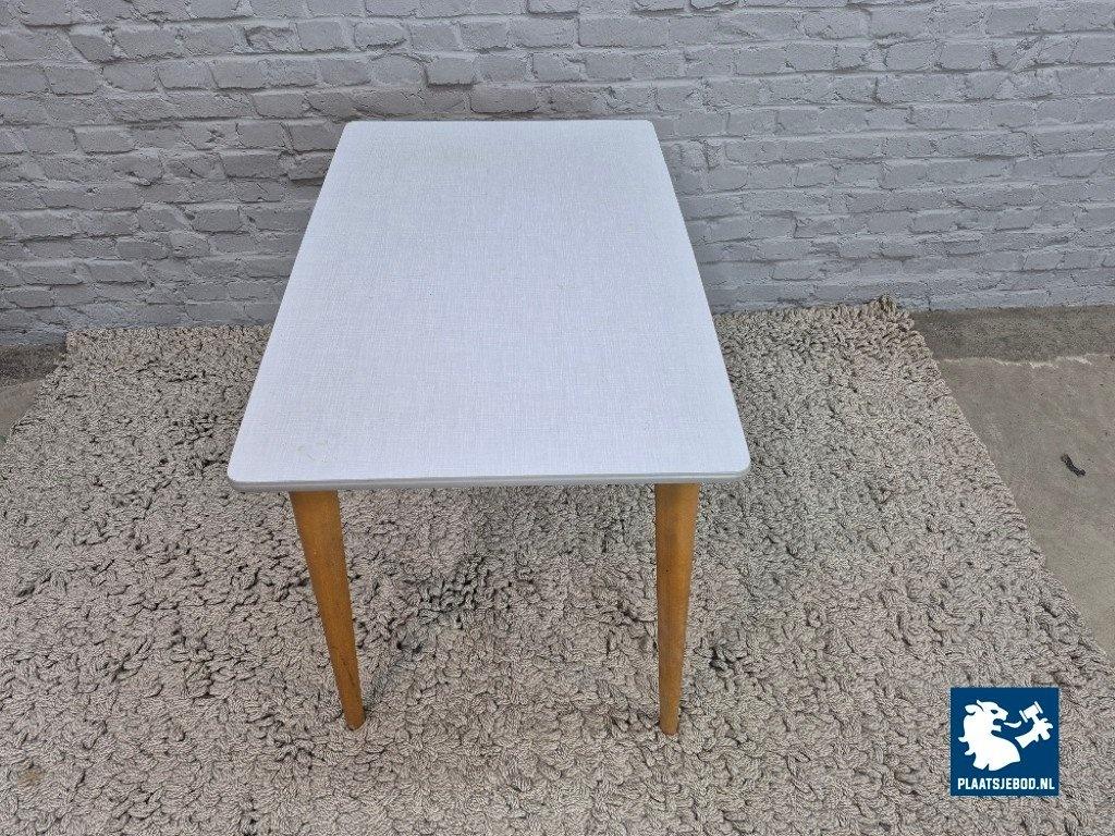 Rectangular vintage kitchen table with a solid wooden frame and light beechwood legs, featuring a grey Formica tabletop with a subtle linen-like texture. The table includes a practical drawer beneath the top, finished with a decorative floral knob, adding a charming and functional detail. A compact and honest mid-century kitchen table, ideal for smaller kitchens or breakfast corners. As with all vintage items, light signs of use may be present and contribute to its authentic character. Dimensions: Height 73 Width 90 Depth 60 cm.