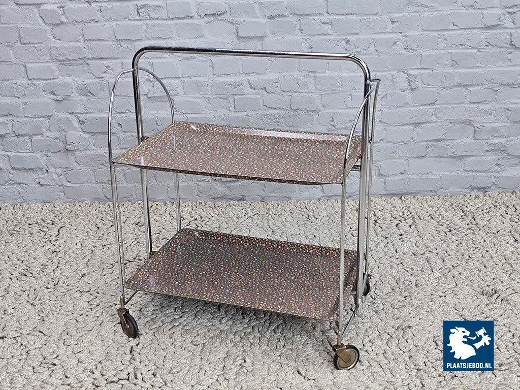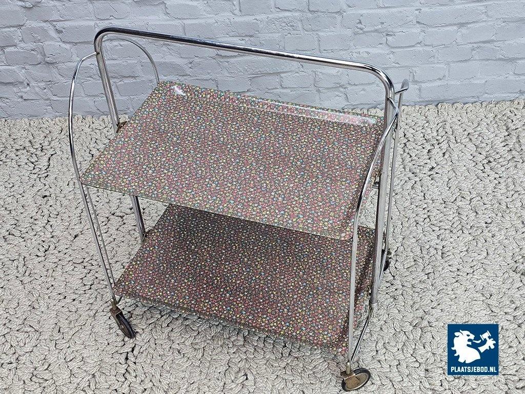 Kavel 305-142-TT720-1-A: Vintage Foldable and Mobile Chrome Steel 2 Floral Decorated Layers ‘Dinett’ Serving Trolley by Bremshey Gerlinol, Germany, 1970s.