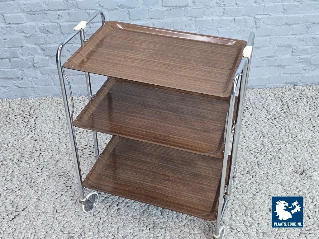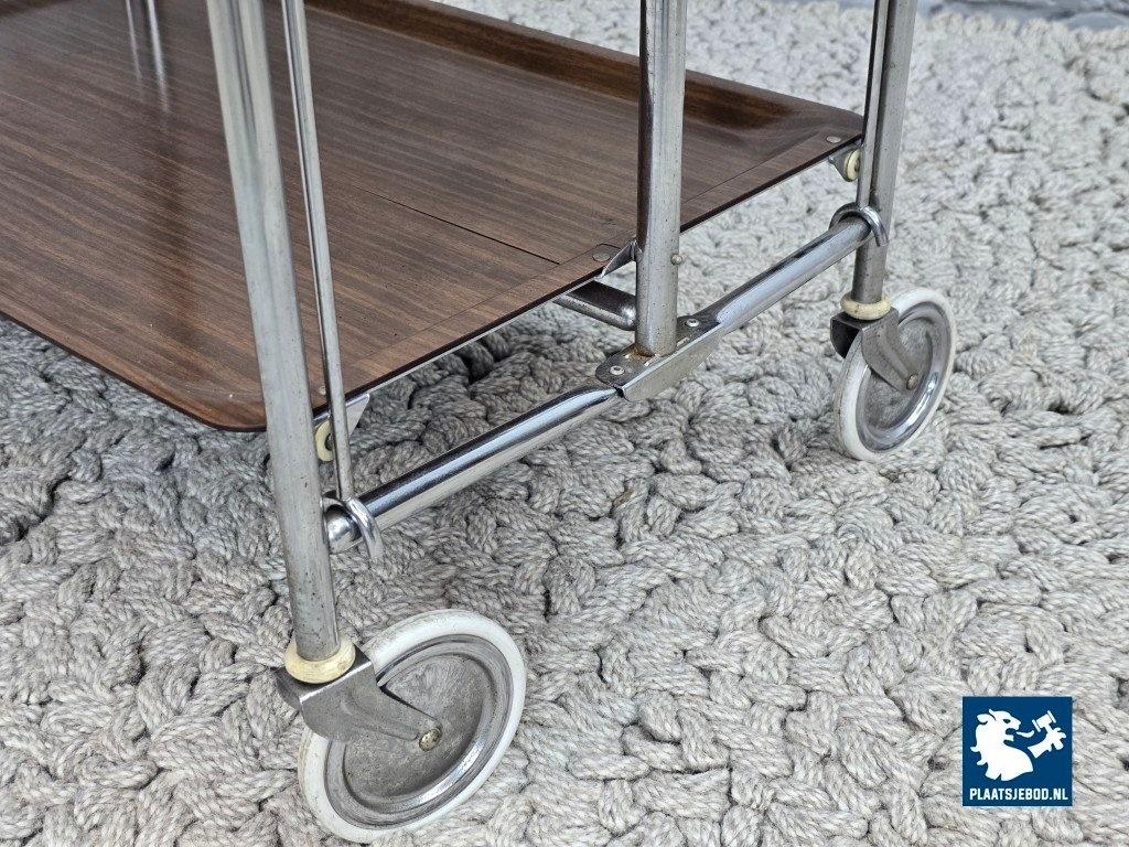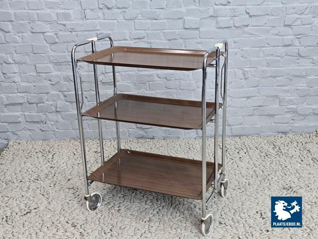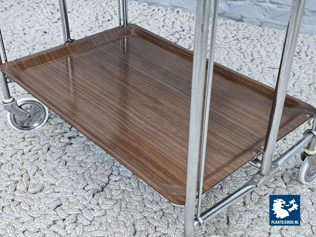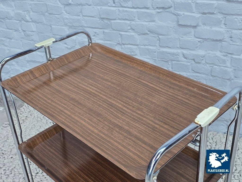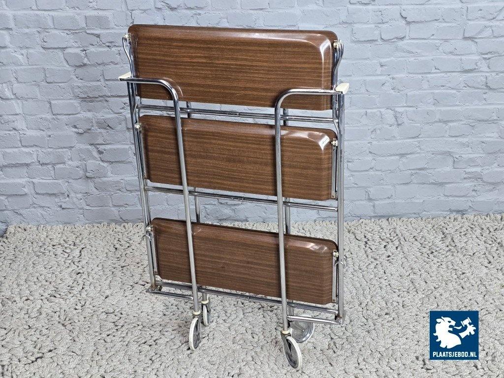 Kavel 311-087-TT723-A1b: Vintage Foldable and Mobile Chrome Steel 3 Faux Wood Layers ‘Dinett’ Serving Trolley by Gerlinol, Germany, 1970s.