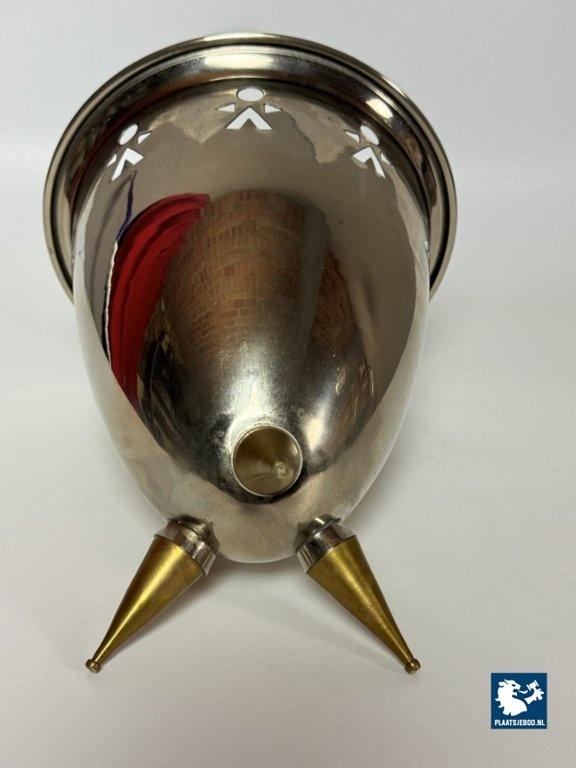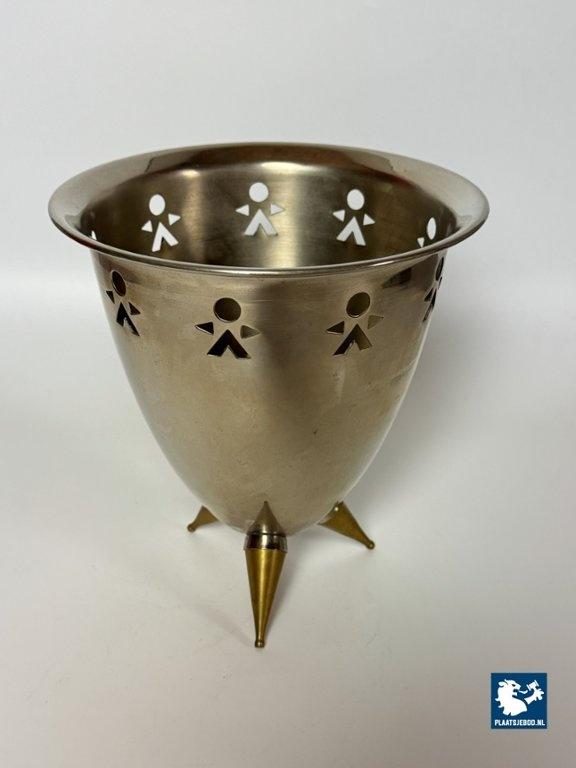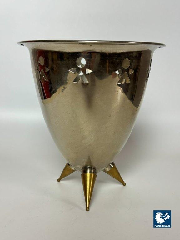 Sculptural stainless steel cooler / ice bucket in a playful postmodern design, featuring a rounded conical body pierced with stylised geometric human figures around the rim. The piece stands on three brass conical feet, giving it a light, architectural presence. The combination of polished steel, graphic cut-outs and brass tripod base strongly recalls Italian design language of the 1980s, particularly work associated with Alessi, though this example is unmarked and not attributed to Alessi. It’s in Good vintage condition; surface wear and patina consistent with age, structurally sound. European manufacture, circa 1980s. The humorous figurative cut-outs and mixed-metal construction place this firmly within late-modern / postmodern domestic design, a period influenced by Italian radical design but widely interpreted by other European makers. Dimensions: Heighgt 23,5 Diameter 21,5 cm